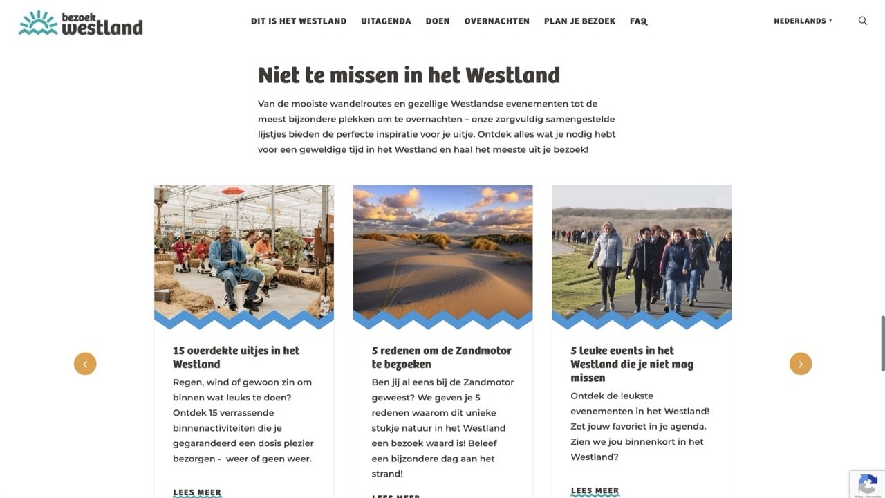 Bezoek Westland is een gebiedsmarketing website ter promotie van Het Westland. De website is gemaakt met het Wordpress CMS. De site heeft tienduizenden page views per maand, en is daarom helemaal geoptimaliseerd voor snelheid en hoge bezoekers aantallen. Er zijn veel verschillende manieren voor het weergeven van content, van verschillende lijstjes, galleries, sliders tot full screen elementen.